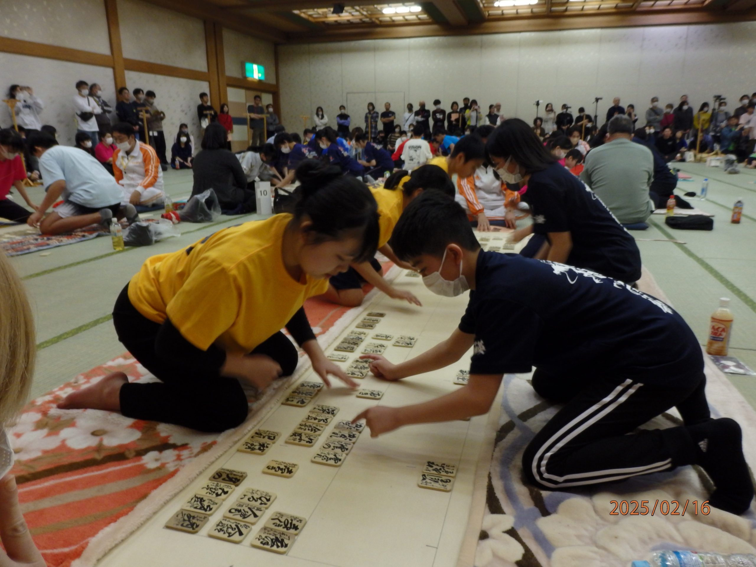 読み手が札を読み上げるときの一瞬の静寂ののちに最初の一文字が発声されるかいなや手が正確に動き、 かけ声とともに木札の飛ぶ音、畳を叩く音、そして周りの応援の拍手と歓声が試合開始から終了まで休む間もなく続いていました。